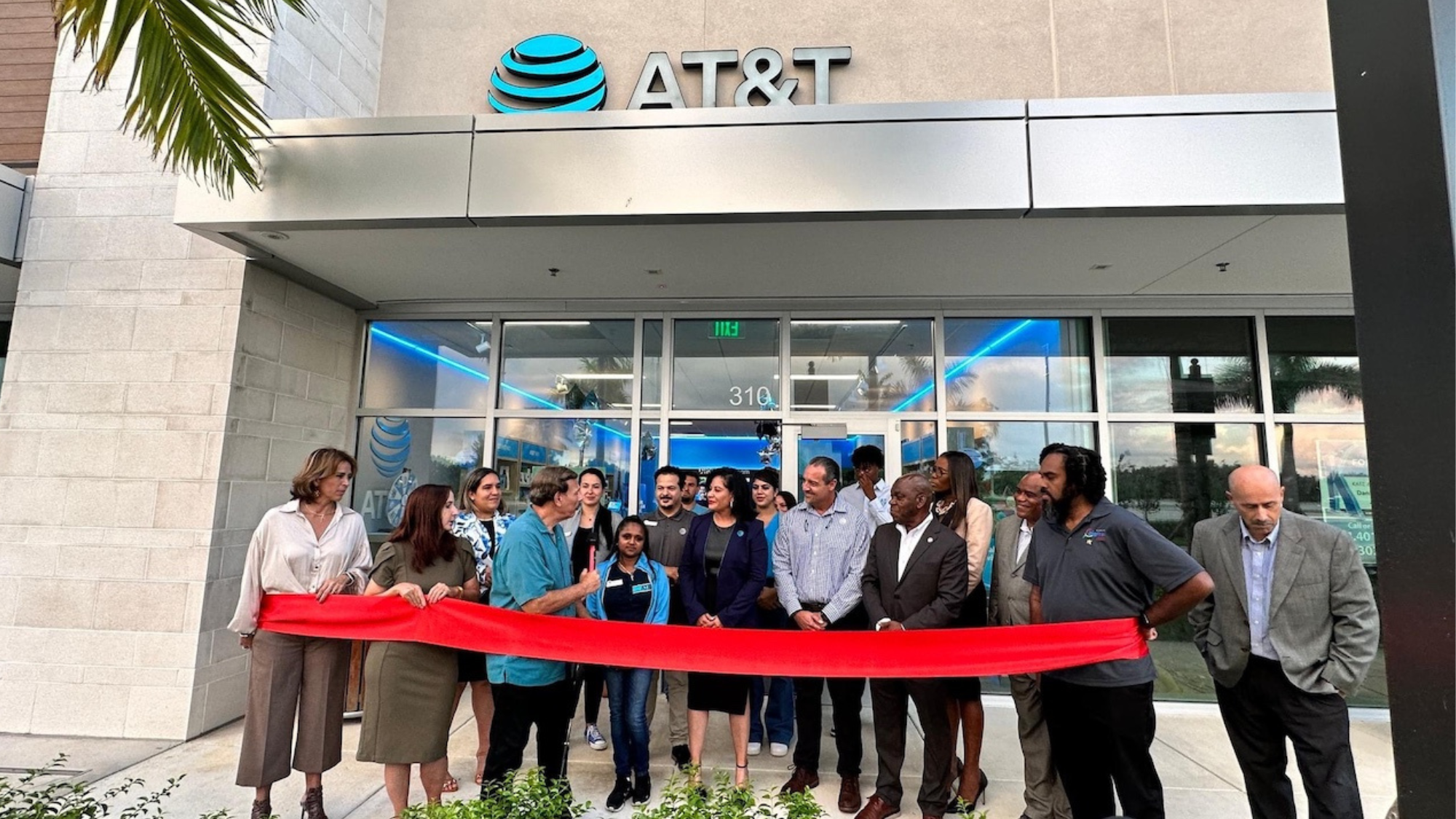 Business leaders and team members gathered at a retail store grand opening, with a speaker holding a microphone in front of a ceremonial ribbon.